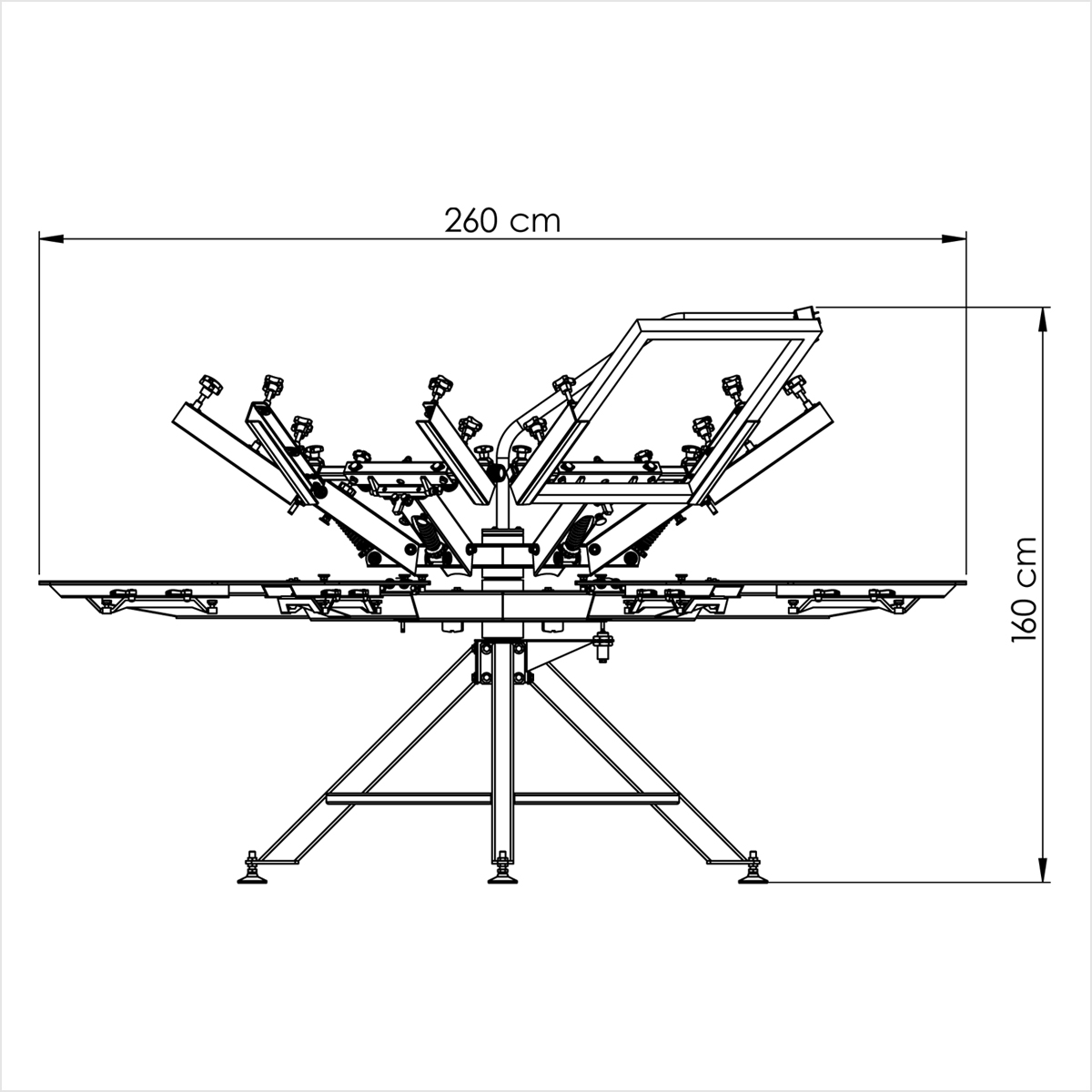 Die THUNDER ist eine manuelle Siebdruckmaschine in Industriequalität, die durch ihre massive und dennoch präzise Ausführung glänzt. Wie sich schon auf den Fotos erahnen lässt, ist diese Maschine für den störungsfreien jahrzehntelangen Einsatz in der Textildruckindustrie konzipiert. Sie eignet sich sowohl für den ambitionierten Einstieg auf höchstem Niveau als auch für Profianwender mit hohem Anspruch an Qualität und Funktionalität. Das Karussell ist mit einem Doppellagersystem ausgestattet und somit besonders stabil und einfach zu handhaben. Herzstück des Karussells ist die Dreipunkt-Mikroregistration für die passgenaue Ausrichtung bei CMYK- oder Mehrfarbdrucken. Dazu kommen die verstärkt geschweißten Trägerarme für die Druckplatten und die stabilen Side Clamps für den perfekten Halt von normalen und übergroßen Siebdruckrahmen. Standardmäßig wird die Maschine mit langlebigen Aludruckplatten mit Spezialgummibeschichtung geliefert.